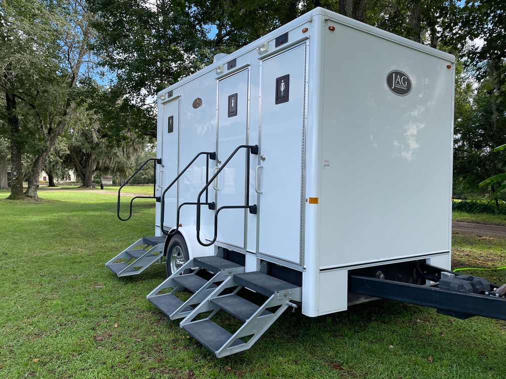 When your Charleston event demands high-capacity luxury, our Four-Stall Luxury Suite delivers. This JAG Porta Lisa Plus 4-Station trailer features separate men's and women's facilities with individual entrances, making it the premium choice for wedding receptions, corporate galas, and large celebrations throughout the Lowcountry.