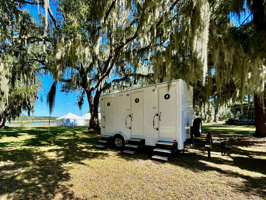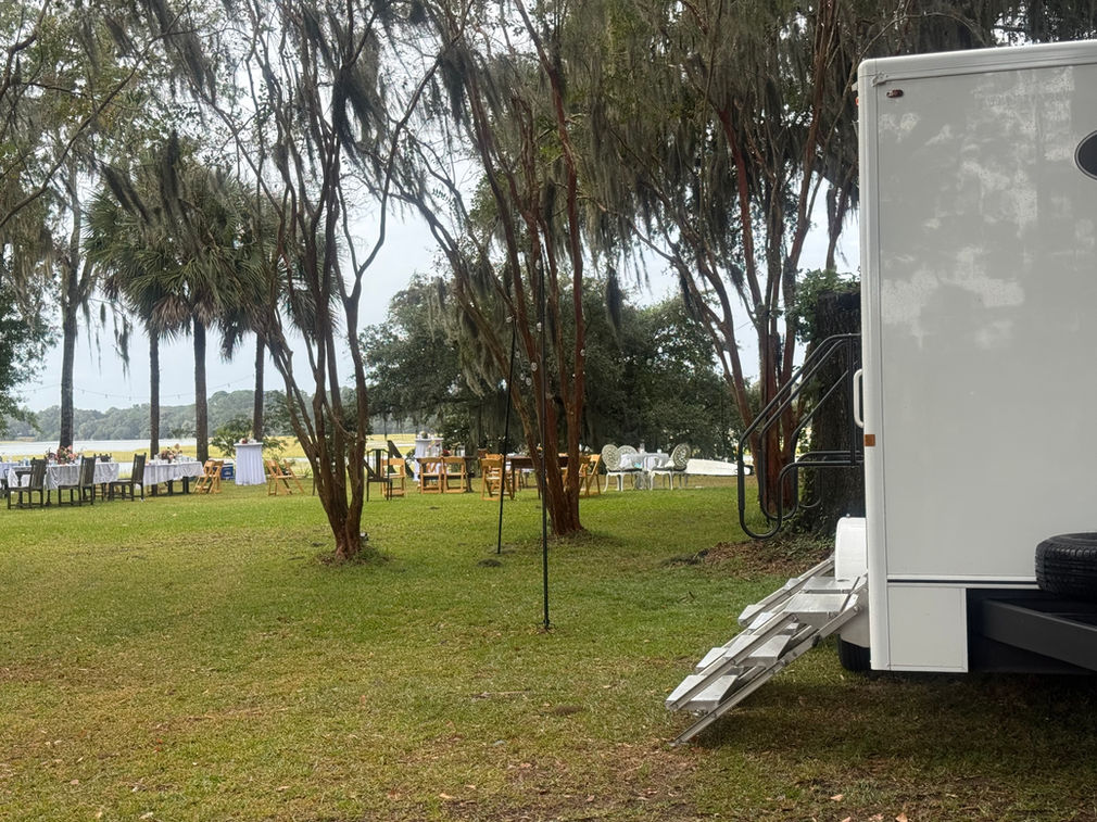 Serving 350+ guests for 6-8 hours, this 12' x 7' (17' with tongue) luxury bathroom trailer is perfect for oyster roasts, family reunions, charity fundraisers, and outdoor concerts. When your event's caliber demands exceptional restroom facilities, this four-station trailer matches your high standards with Charleston hospitality.